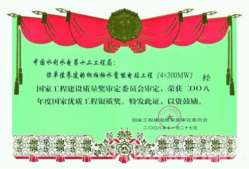 桐柏抽水蓄能电站工程荣获2008年度国家优质工程银质奖