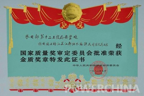浙江省温州市珊溪水库工程荣获2006年度国家优质工程银质奖