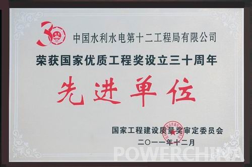 公司荣获“国家优质工程奖设立三十周年先进单位”