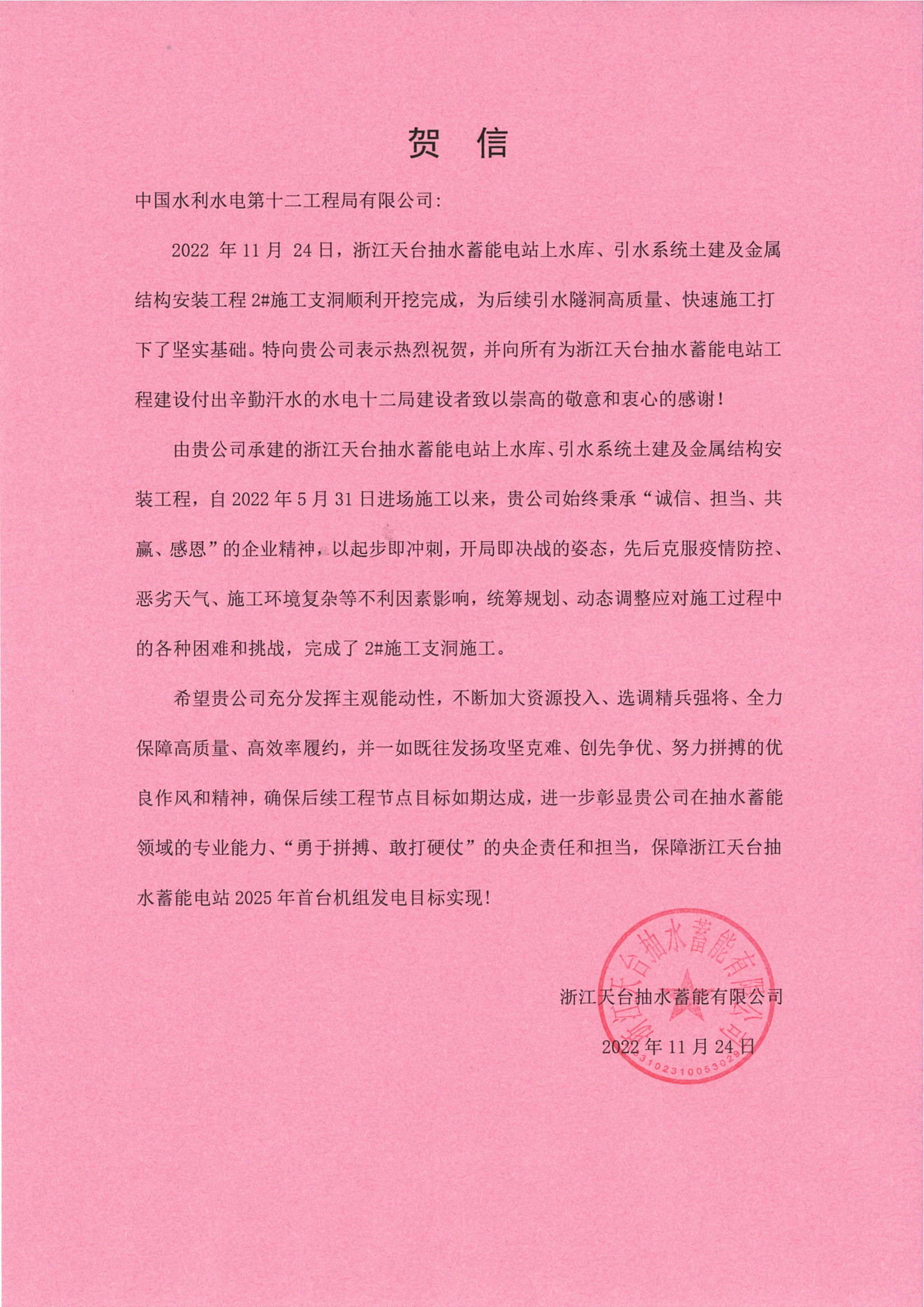 近日,天台抽水蓄能电站2号施工支洞开挖顺利完成,为引水隧洞高质量施工打下坚实基础。浙江天台抽水蓄能有限公司发来贺信。 自2022年6月1日进场施工以来,项目部先后克服地质条件复杂、施工条件恶劣、疫情防控压力大等不利因素影响,统筹规划、科学管理、精心组织、动态调整,全力以赴推进工程建设。施工支洞工程是天台抽水蓄能电站工程的咽喉工程,2号施工支洞是整个引水系统工程的关键节点,是引水中平洞、下斜井的施工通道,为城门洞型断面,洞长1584.72米,净断面尺寸8.0米×9.0米。项目部充分发挥自身优势,不断加大资源投入,确保了2号施工支洞施工任务的圆满完成。 天台抽水蓄能电站是国家“十四五”重点实施项目、浙江省“十四五”期间规划的重大建设项目,电站总装机容量170万千瓦。电站额定水头724米世界最高,单机容量42.5万千瓦位居国内之首,上下引水斜井长度483.4米全国第一。电站建设难度位于国内前列,建设过程中将刷新多项纪录,推动抽水蓄能电站建设水平迈上世界新高地。公司主要施工范围为上水库工程、引水系统工程、上下水库连接公路,以及相关压力钢管制作及安装、金属结构安装等。 天台抽水蓄能电站计划于2025年12月实现首台机组投产发电,建成后预计年发电量17亿千瓦时,可节约燃煤消耗量约52万吨,减少排放二氧化碳约104万吨,环境效益显著。电站主要承担浙江电网的调峰、填谷、调频、调相、储能及紧急事故备用等任务,并为华东电网提供灵活调度能力。 天台项目部将持续发扬攻坚克难、创先争优、努力拼搏的优良作风,进一步加强现场精细化管理,勠力同心、再接再厉,为巩固公司抽水蓄能电站施工“拳头”品牌国内领先地位而努力奋斗。