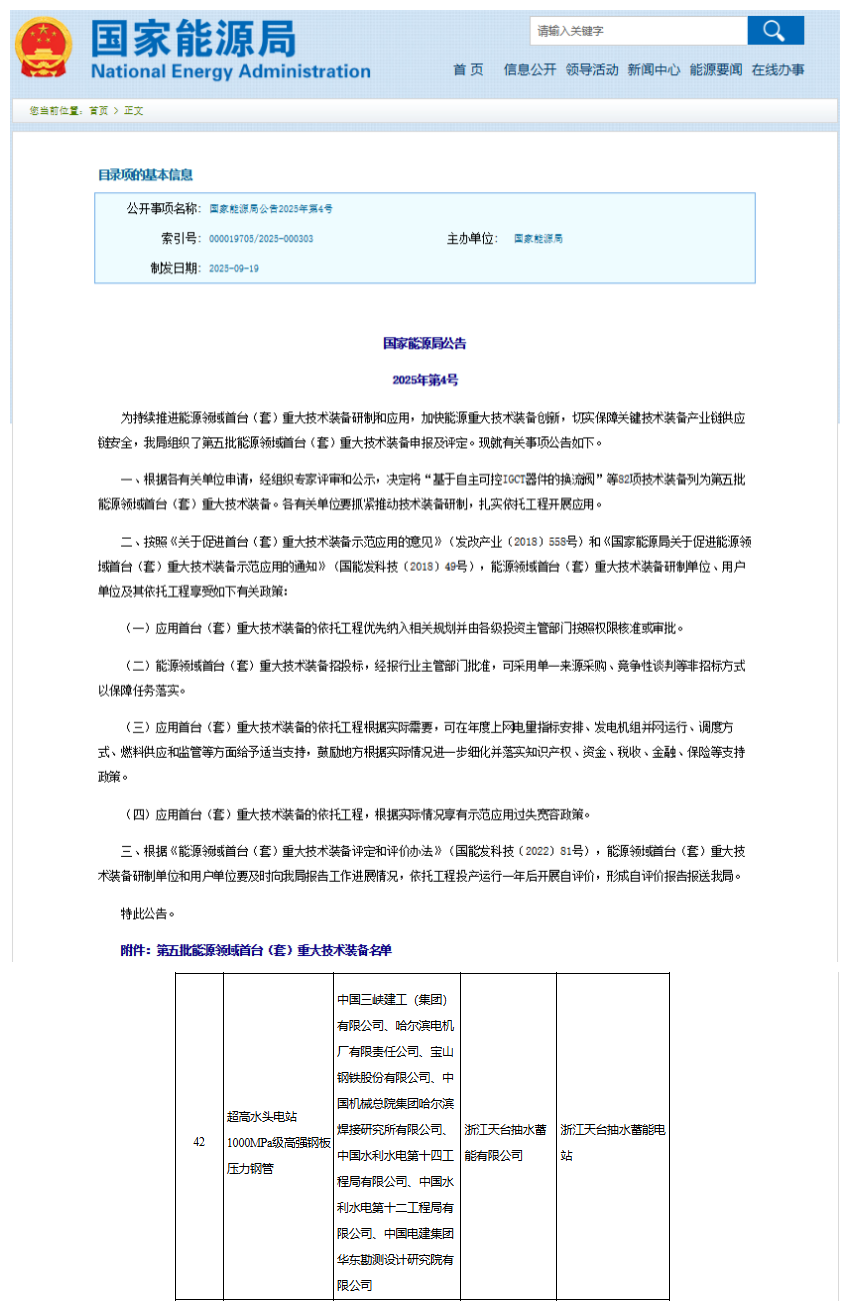 近日,国家能源局正式发布2025年第4号公告,公布了第五批能源领域首台(套)重大技术装备名单。公司依托于浙江天台抽水蓄能电站项目的“超高水头电站1000兆帕级高强钢板压力钢管”凭借其卓越的技术创新性与工程应用价值,成功入选该名单。 首台(套)重大技术装备认定是国家为鼓励和推动能源领域关键技术装备攻关、示范应用而设立的重要制度,旨在引导行业突破技术瓶颈,打破国外垄断,提升装备自主化水平和国际竞争力。本次入选,是对公司在水电装备领域技术研发实力与高端制造能力的国家级权威认可,也标志着公司在超高水头1000兆帕级高强钢板压力钢管关键装备规模化工程应用方面走在了行业前列。 公司作为中国电建集团旗下的骨干企业,始终坚持以科技创新驱动高质量发展,深耕水电、抽水蓄能等工程建设领域。此次“1000兆帕级高强钢板压力钢管”的成功研发与入选,是公司长期致力于核心技术攻关、产学研深度融合的结晶,凝聚了研发团队与工程技术人员的心血与智慧,以实际行动践行了“大国重器”的使命担当,为我国高端装备技术自立自强注入了强劲动力,展现了“中国建造”的硬核实力。 今后,公司将以此为契机,继续紧跟国家重大能源建设项目发展战略,持续加大科技创新投入,不断推动重大技术装备的升级与迭代,积极助力新型能源体系建设和能源科技自立自强,为保障国家能源安全和推动绿色低碳发展贡献“十二局力量”。