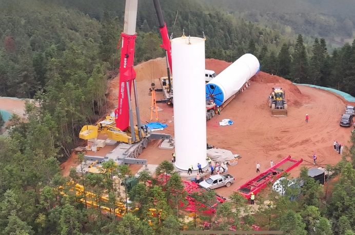 3月30日,由公司承建的大唐华银桂东普洛风电项目首台风机塔筒吊装工作圆满完成,标志着项目全面进入机组安装阶段,为后续并网发电奠定了坚实基础。 本次吊装的首段塔筒高度约18.78米、最大直径4.98米,重达65.5吨,采用大型履带吊主吊、辅吊配合的方式进行作业。塔筒吊装属高空、高风险作业,对吊装设备、施工组织、安全管控及天气条件要求极高。 近期桂东持续降雨,影响设备运输与场地平整。项目部提前制定专项方案,采用无人机与地面巡查结合动态监测路况,及时铺设碎石垫层保障运输;同时编制吊装方案,组织专家论证与安全交底,严格把控设备验收、吊具检查及人员资质。吊装前严格压实场地、全面排查起重机等设备。3月30日下午,12#风机平台压实后迎来黄金窗口期,主辅吊采用双机抬吊递送法协同配合,平稳完成塔筒起升。过程中团队密切配合,技术人员全程旁站监督,塔筒顺利就位,各项指标符合设计要求,获得业主与监理一致好评。 首节塔筒吊装就位,标志着普洛项目取得了阶段性胜利,为后续风机顺利吊装施工奠定基础。下一步,项目部将继续强化安全质量管控,有序推进剩余塔筒吊装、机组安装及电气调试等工作,全力冲刺项目全容量并网目标。